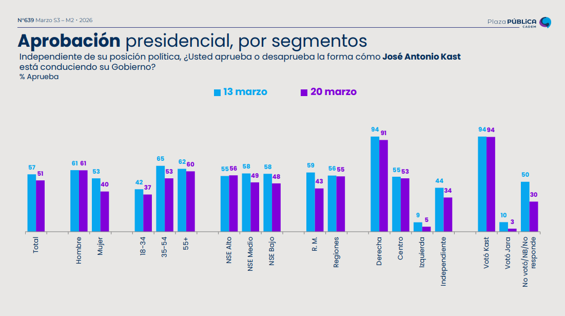 En detalle, entre los segmentos consultados, las mujeres se ubicaron como el grupo donde el jefe de Estado reportó una dura caída, descendiendo 13 puntos, lo que se traduce en un 40% de aceptación.