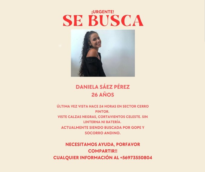 Carabineros y voluntarios de Socorro Andino de Chile buscan intensamente a la joven que se extravió mientras subía el cerro junto a un amigo. La desaparición de Daniela Sáez ocurrió cuando comenzó el ascenso cerca de las 5:00 horas junto a Hernán, sin embargo, él no pudo continuar la ruta y paró en el sector El Pintor, mientras que la joven siguió avanzando sola.