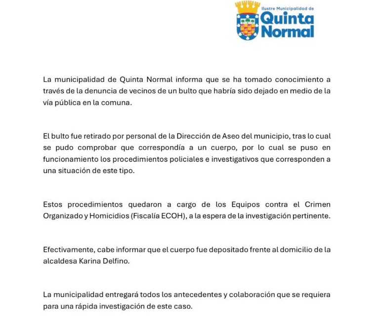 La Muncipalidad de Quinta Normal confirmó durante la noche de este domingo 8 de marzo que el cadáver encontrado al interior de una caja y con sus extremidades maniatadas fue dejado frente al domicilio de la alcaldesa Karina Delfino.