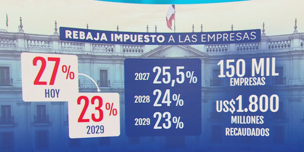 - Rebaja de Impuesto de Primera Categoría (IDPC) de 27% a 23% y reintegración del sistema