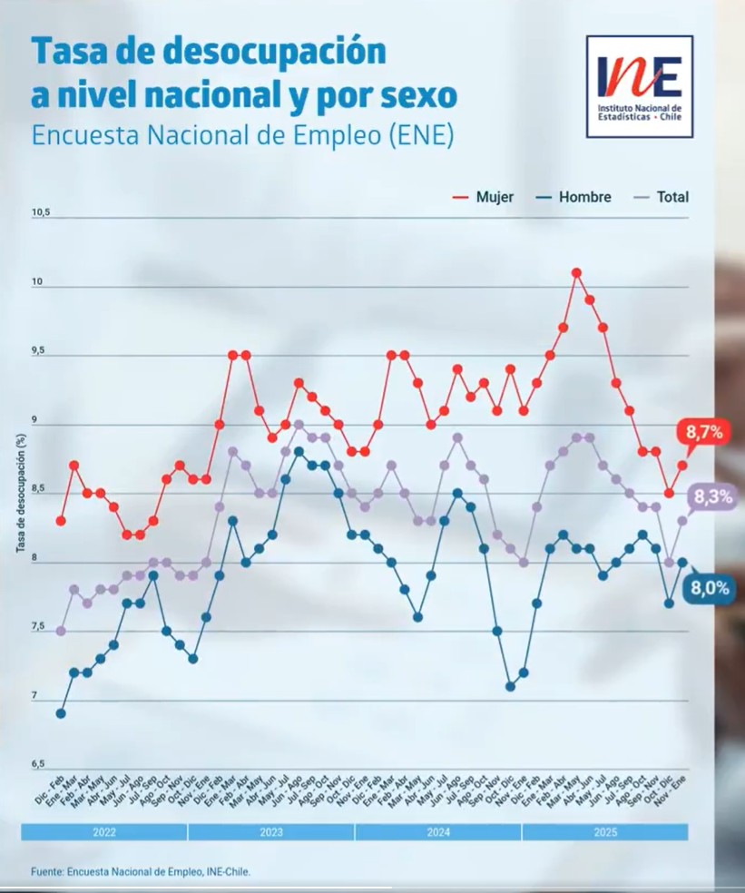 El escrito de Evelyn Matthei fue acompañado de una publicación del Instituto Nacional de Estadísticas (INE), compartida a través de la misma plataforma. En esta se da a conocer que la tasa de desocupación nacional correspondiente al trimestre comprendido entre noviembre del año pasado y enero del presente "en doce meses, registró un aumento de 0,3 puntos porcentuales (pp.)".