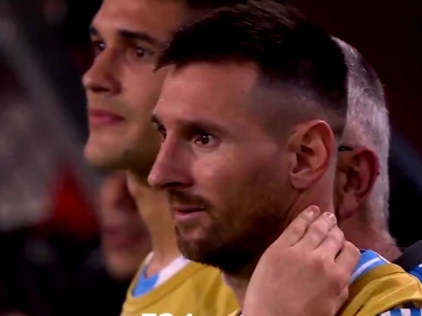 El capitán de la albiceleste, al borde de la cancha tras salir lesionado, fue captado justo cuando el árbitro pitó el final del partido.