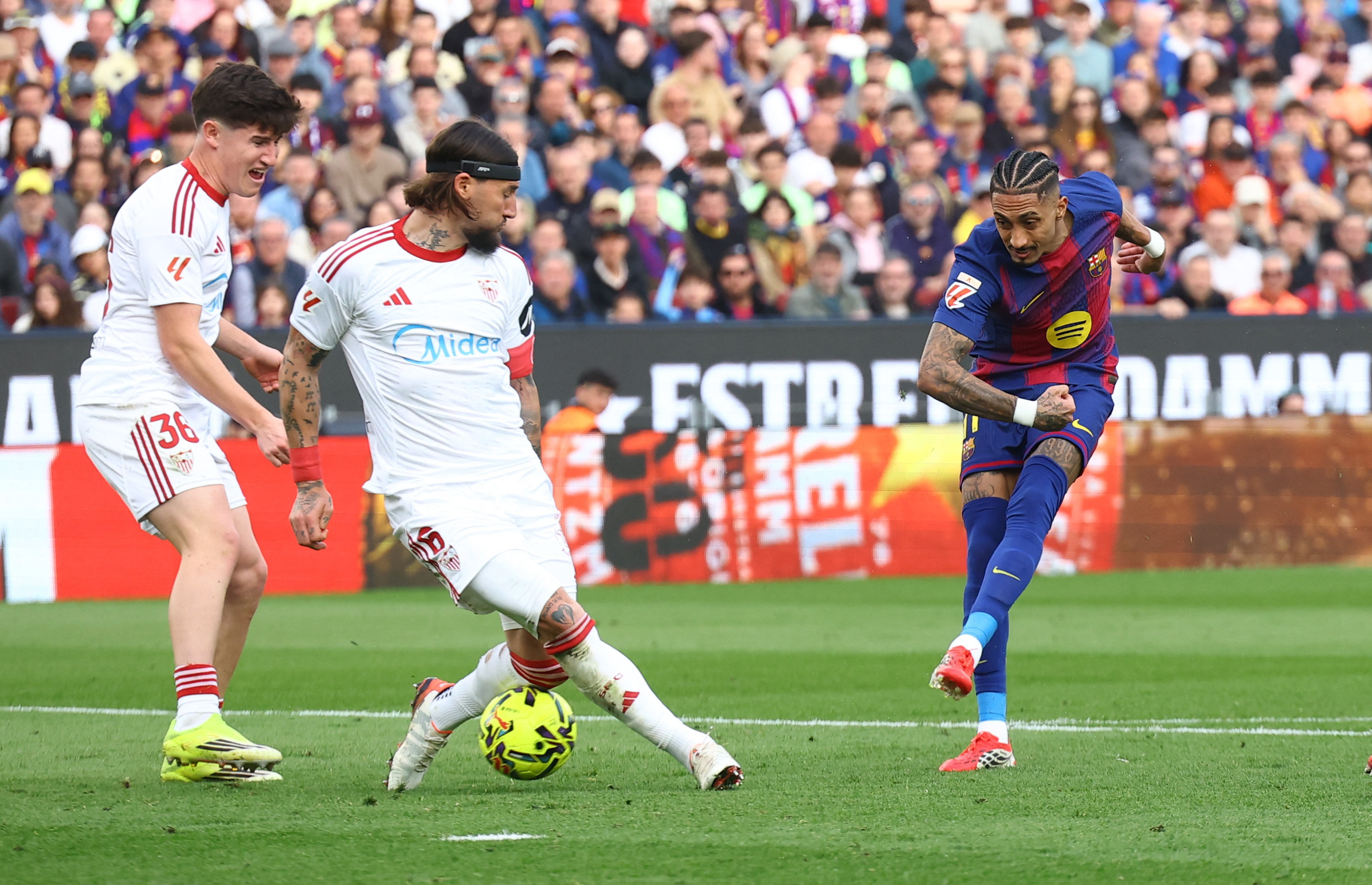 Raphinha anotó un doblete de penal (9', 21') mientras que Dani Olmo (38') aumentó la diferencia en el primer tiempo, pero el descuento de Joaquín Martínez Gauna "Oso" (45'+3') ilusionó a los visitantes con una remontada que no se consumó. El brasileño concretó su triplete (51'), João Cancelo (60') estiró la ventaja y Djibril Sow (90'+2') cerró tardíamente la cuenta.