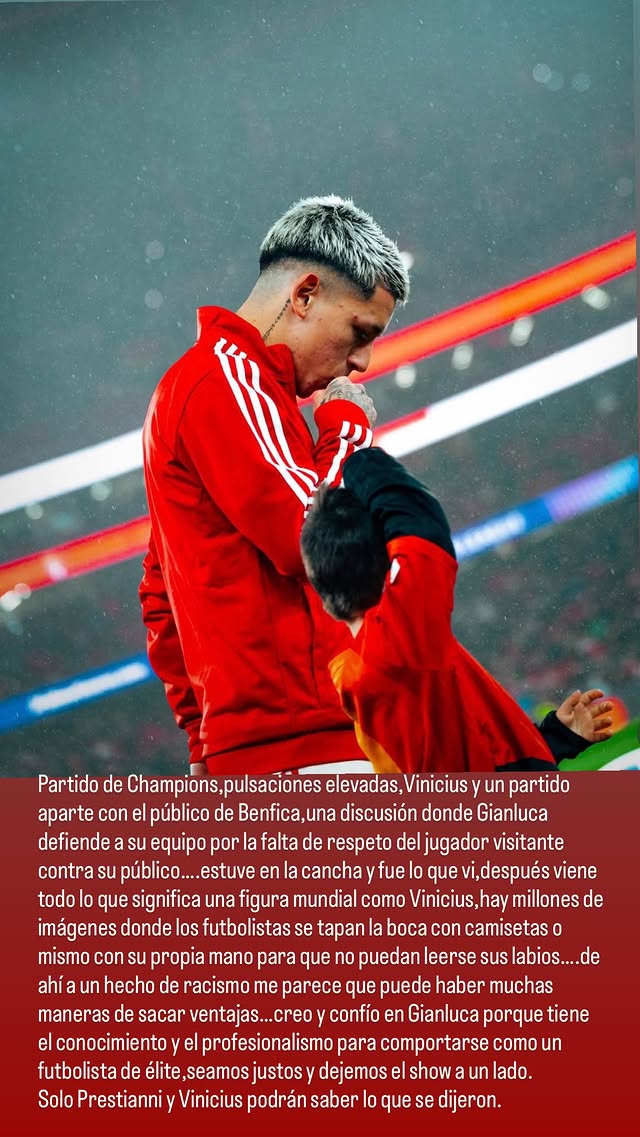 “Partido de Champions, pulsaciones elevadas, Vinícius y un partido aparte con el público del Benfica, una discusión donde Gianluca defiende a su equipo por la falta de respeto del jugador visitante contra su público... Estuve en la cancha y fue lo que vi”.