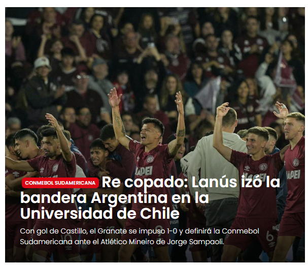 Universidad de Chile perdió 1-0 contra Lanús y se despidió en las semifinales de la Copa Sudamericana, resultado que captó la atención de la prensa trasandina. "Re copado: Lanús izó la bandera Argentina en la Universidad de Chile. Con gol de Castillo, el Granate se impuso 1-0 y definirá la Conmebol Sudamericana ante el Atlético Mineiro de Jorge Sampaoli", indicó El Gráfico.