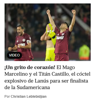 "Lanús superó 1-0 a la Universidad de Chile con una gran definición de Rodrigo Castillo este jueves en el estadio Néstor Díaz Pérez y se clasificó a la final de la Copa Sudamericana 2025. El encuentro tuvo polémica por el arbitraje del venezolano Alexis Herrera y las intervenciones del VAR a cargo de su compatriota Ángel Arteaga", puntualizó Clarín.