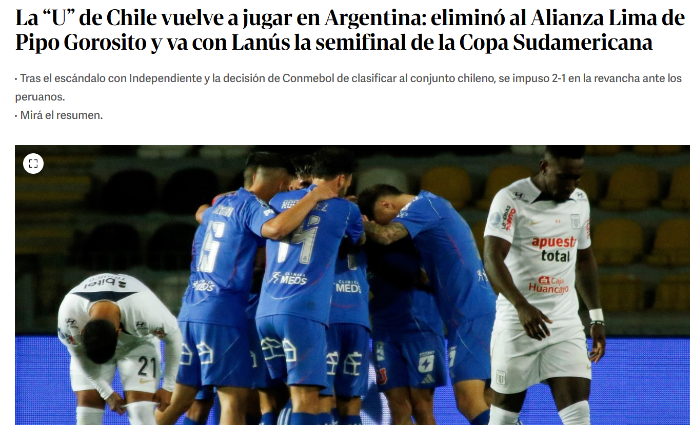 "La “U” de Chile vuelve a jugar en Argentina: eliminó al Alianza Lima de Pipo Gorosito y va con Lanús la semifinal de la Copa Sudamericana", puntualizó Clarín. "Dos meses después de la barbarie y el escándalo contra Independiente, la Universidad de Chile volverá a jugar en Argentina. Serán semanas de mucho trabajo a nivel seguridad no solo para el momento de la visita de Lanús, sino principalmente para cuando llegue la revancha en Buenos Aires", expresó.