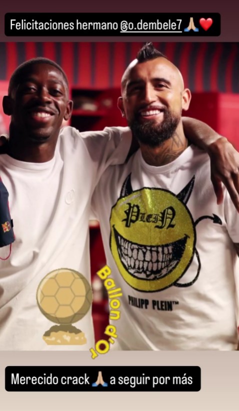 El volante chileno utilizó sus redes sociales para dedicarle unas palabras a su ex compañero en Barcelona junto a una fotografía de ambos: "Felicitaciones hermano. Merecido crack, a seguir por más" escribió el "King".