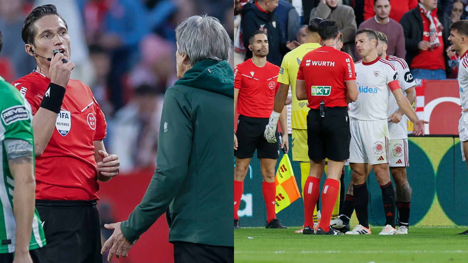 José Luis Munuera Montero, arbitro del partido entre Sevilla y Betis, se fue junto a los jugadores al vestuario por disturbios en la tribuna.#LaLigaEnDSPORTS pic.twitter.com/rTZsbheA6K