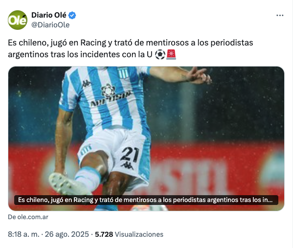 "Es chileno, jugó en Racing y trató de mentirosos a los periodistas argentinos tras los incidentes con la U", así titularon en redes sociales desde el sitio informativo.