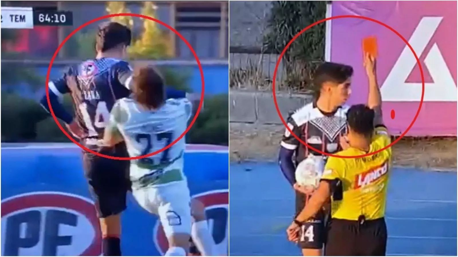 En medio de una disputa de balón, el lateral izquierdo golpeó de manera alevosa con un codazo al rostro del uruguayo y el árbitro Jorge Oses le mostró la tarjeta roja de manera inmediata.