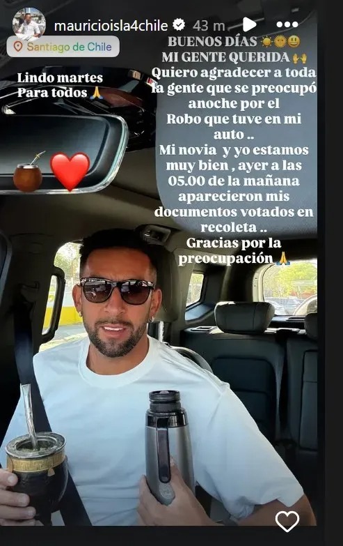 "Quiero agradecer a toda la gente que se preocupó anoche por el robo que tuve en mi auto. Mi novia y yo estamos muy bien. A las 05:00 de la mañana aparecieron mis documentos botados en Recoleta. Gracias por la preocupación", sostuvo.