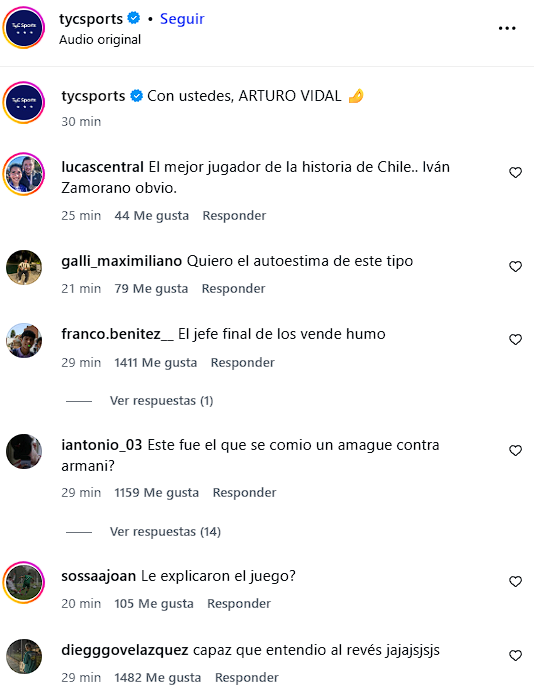 Una recepción distinta tuvo el video de Vidal al otro lado de la cordillera, ya que TyC Sports lo compartió recibiendo una serie de comentarios en contra del volante chileno.