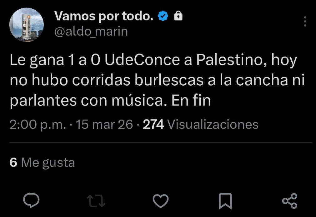 La victoria del Campanil dio pie a un burlesco mensaje de Aldo Marín, director de Azul Azul, concesionaria a cargo de Universidad de Chile. "Le gana 1 a 0 U de Conce a Palestino, hoy no hubo corridas burlescas a la cancha ni parlantes con música. En fin", expresó.