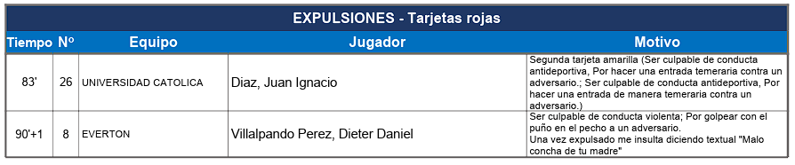 En el documento, publicado por el sitio oficial de la ANFP, se reportó la expulsión de Juan Ignacio Díaz en la UC por hacer una "entrada temeraria contra un adversario" en el 83'.