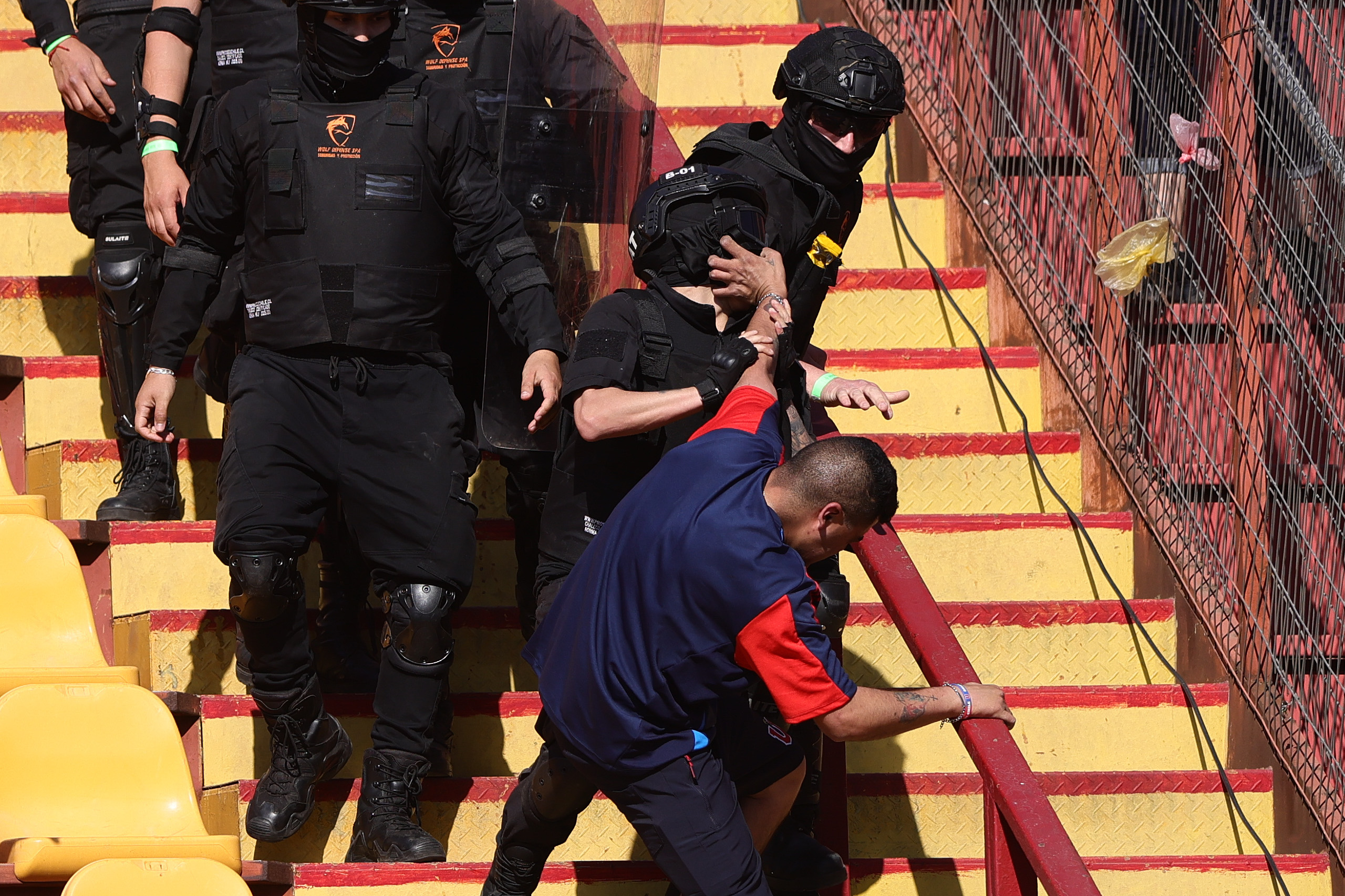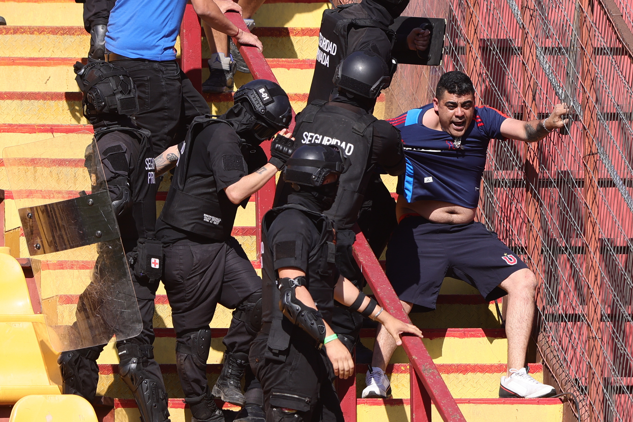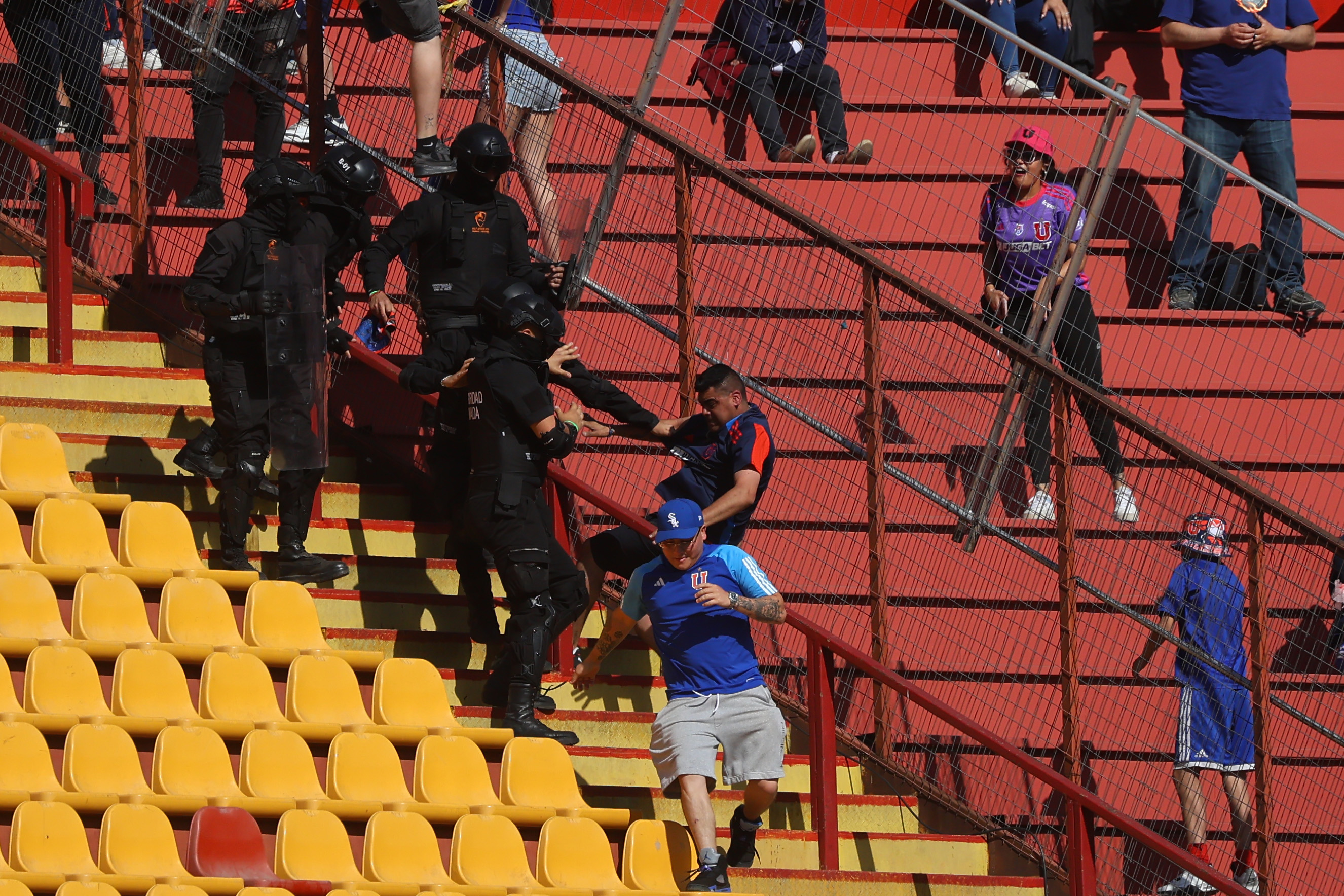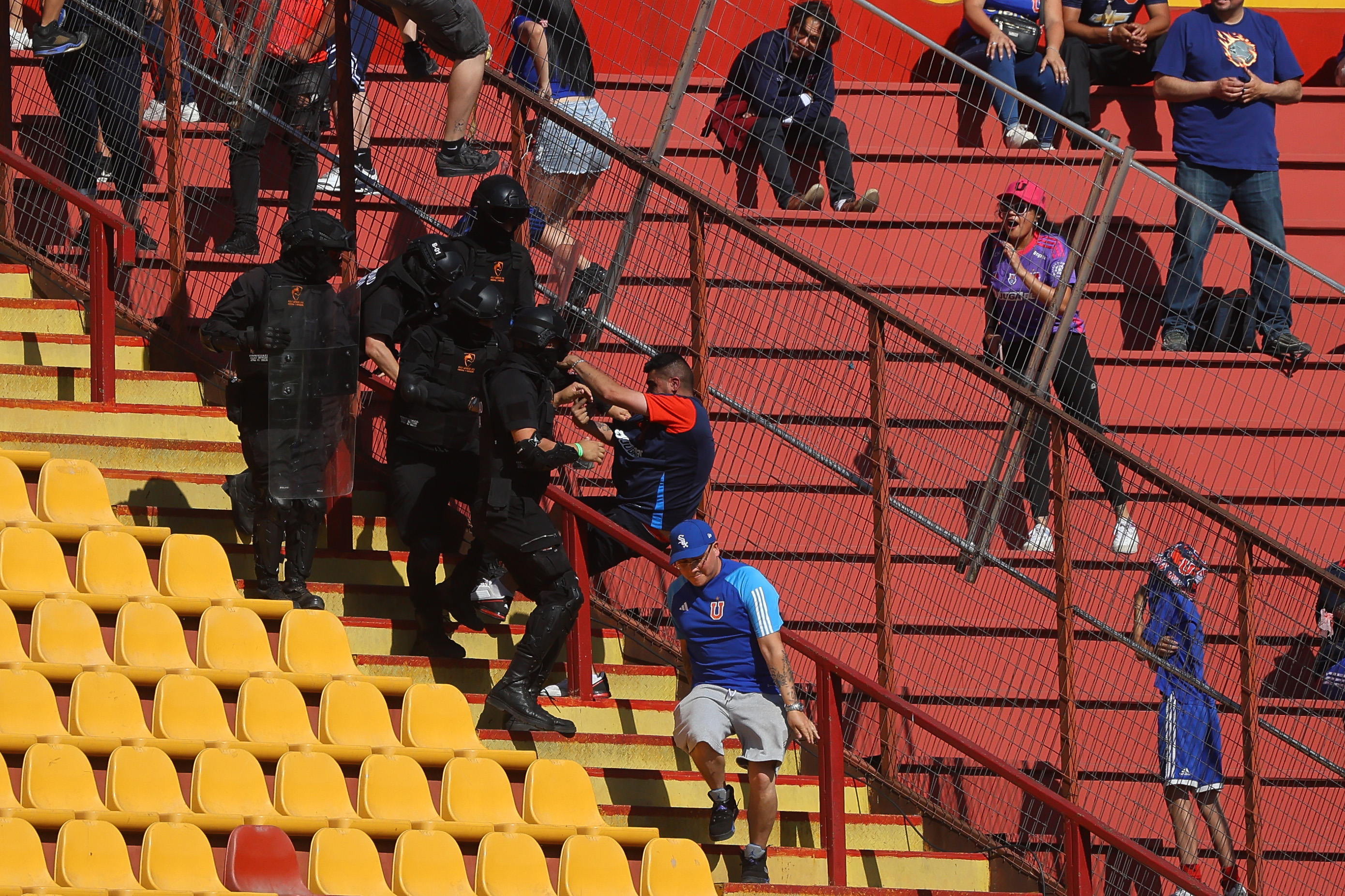 Una cantidad cercano a 20 sujetos vandalizó la reja que dividía la galería sur con la tribuna Andes del Estadio Santa Laura, lo que generó la intervención de los guardias privados situados en el sector.