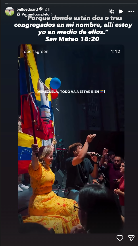Eduard Bello, delantero de Universidad Católica y la Selección de Venezuela, reaccionó con una publicación mediante Instagram. "Porque donde están dos o tres congregados en mi nombre, allí estoy yo en medio de ellos", compartió el futbolista junto a un video de una oración con el lema "Venezuela, todo va a estar bien".
