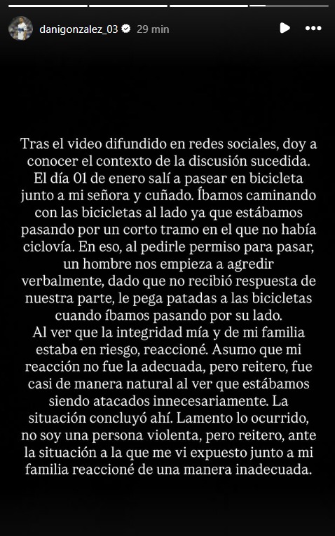 "Tras el video difundido en redes sociales, doy a conocer el contexto de la discusión sucedida. El día 1 de enero salí a pasear en bicicleta junto a mi señora y cuñado. Íbamos caminando con las bicicletas al lado ya que estábamos pasando por un corto tramo en el que no había ciclovía", comenzó.
