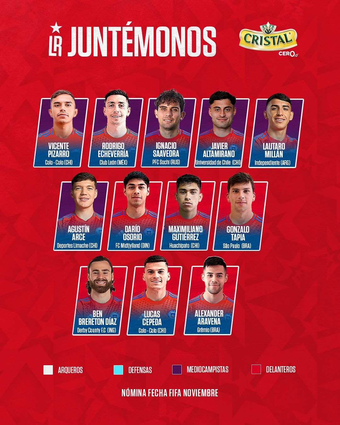 El técnico Nicolás Córdova oficializó la nómina de la selección chilena que afrontará los compromisos ante Rusia y Perú, pactados en el marco de la doble fecha FIFA a disputarse en el mes de noviembre.