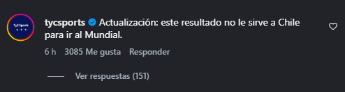 "CHILE LE GANÓ UN AMISTOSO A CABO VERDE EN NUEVA ZELANDA. Actualización: este resultado no le sirve a Chile para ir al Mundial", sostuvo TyC Sports de manera socarrona.