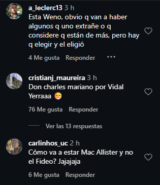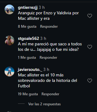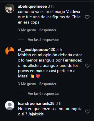 Asimismo, también descartó a Jorge Valdivia y Eduardo Vargas, colocando en dichos puestos a Lionel Messi y Julián Álvarez mientras que Alexis Sánchez cerró la oncena.