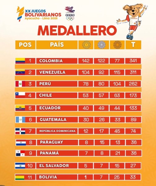 Medallero Juegos Bolivarianos 2025