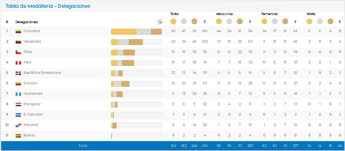 La lista es encabezada por el anfitrión con 165 medallas, seguido de Venezuela (102).