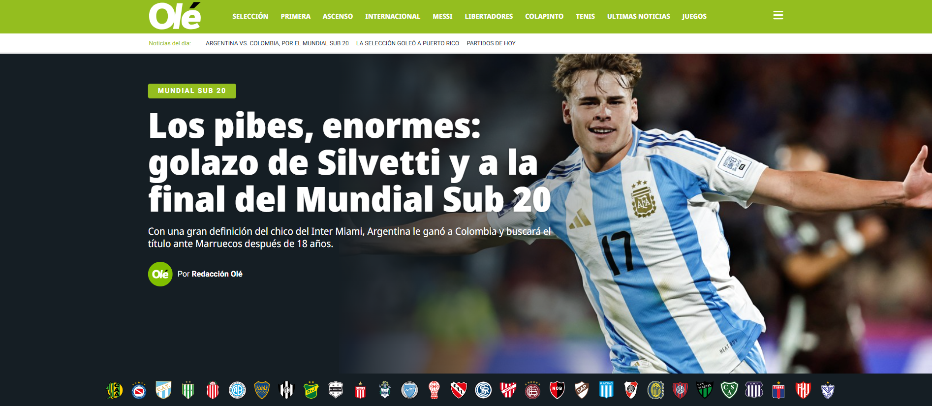 "¡¡Vamos los pibes!! Argentina derrotó a Colombia y está en la final", expresó TyC Sports en su perfil de Instagram. "El equipo de Diego Placente irá por el séptimo campeonato mundial en la categoría este domingo, cuando se enfrenté a Marruecos", complementó en su portal digital. "Una idea muy similar utilizó Olé para destacar lo hecho por los dirigidos de Diego Placente. "Vamos los pibes: Argentina le ganó a Colombia y está en la final del Mundial Sub 20", indicó.