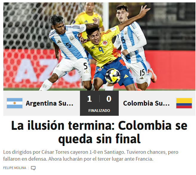 "La Selección Colombia se quedó sin el boleto a la final de la Copa del Mundo Sub-20 de la FIFA 2025, en Chile, tras perder 1-0 contra Argentina", cerró El País.