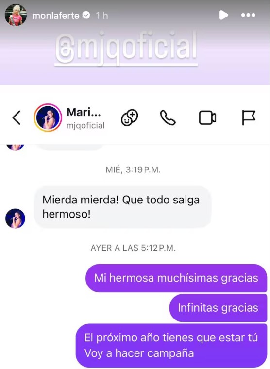 En la misma imagen que mostró Mon Laferte en sus redes sociales, se muestra la respuesta a Quintanilla: "Mi hermosa, muchísimas gracias. Infinitas gracias".