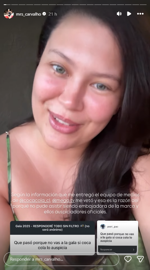 En esa misma publicación escribió: "Según la información que me entregó mi equipo de medios de Coca-Cola. Mega me vetó y esa es la razón de por qué no puedo asistir siendo embajadora de la marca y ellos auspiciadores oficiales".
