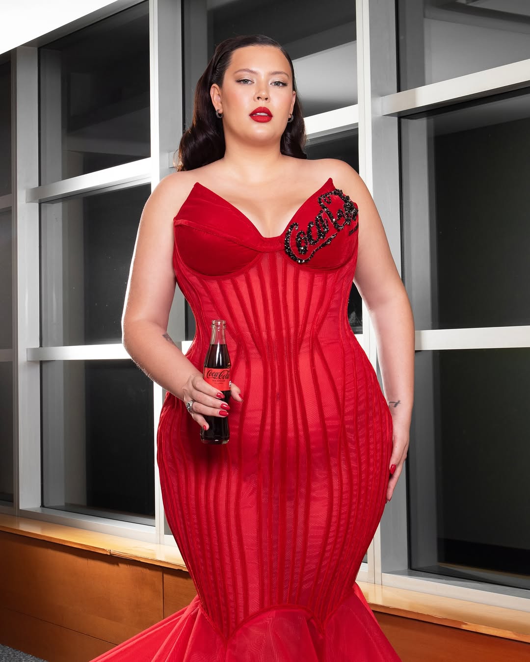 Recordemos que la exchica reality representó el año pasado a Coca-Cola y lució un vestido rojo en el que, en un costado, aparecía el nombre de la marca con detalles de lentejuelas. Esto generó gran controversia porque Pepsi auspiciaba la Gala en ese entonces.