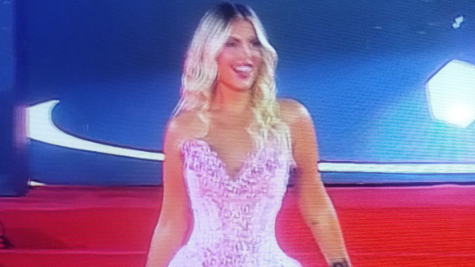 En la instancia, la modelo usó un vestido rosado al estilo Barbie con destellos brillantes y gran volumen abajo de la cadera.
