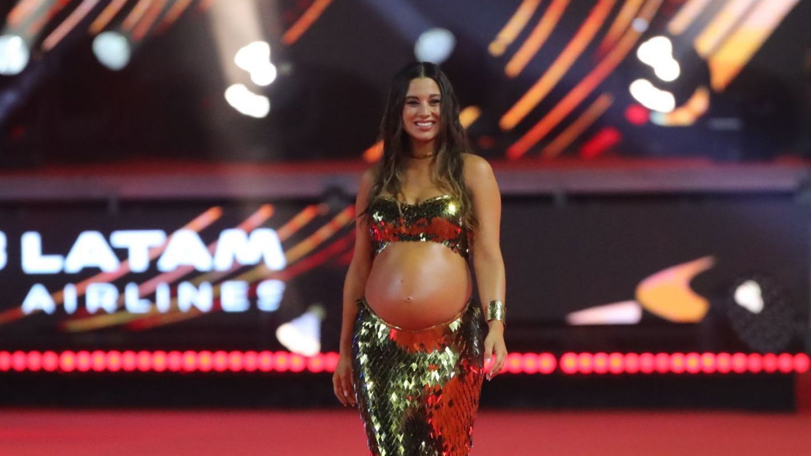 Con un traje de dos piezas de lentejuelas y dorado, mostrando su guatita, la deportista brilló mientras recorría el Sporting Club de Viña del Mar.