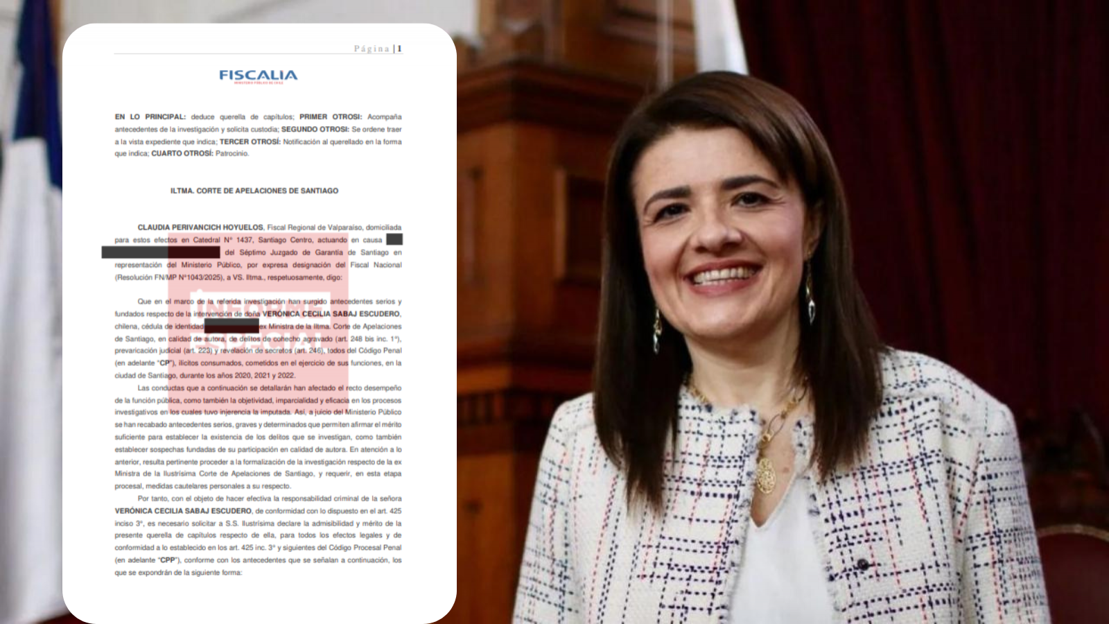 La fiscal regional de Valparaíso, Claudia Perivancich Hoyuelos, interpuso una querella de capítulos en contra de la destituida ministra de la Corte de Santiago, Verónica Sabaj, en la que solicitó su desafuero.