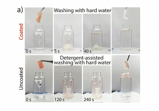 La resistencia del recubrimiento también sorprendió a los investigadores: soportó alrededor de 100 aclarados, 2.000 pliegues y pruebas de abrasión con papel de lija sin perder eficacia, manteniendo su resistencia a las manchas incluso tras compararlo con prendas lavadas con detergente convencional.