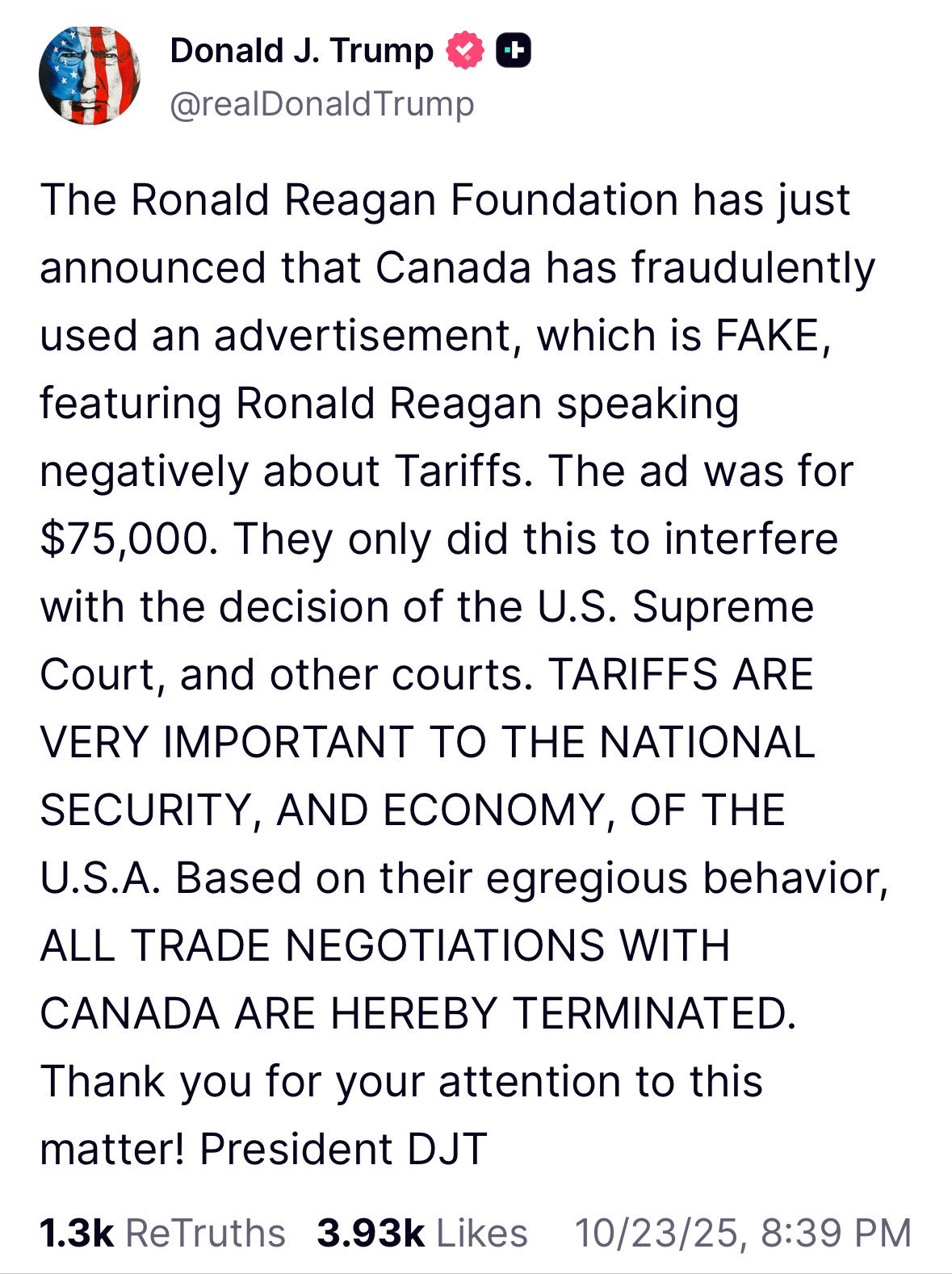 Finalmente, y con claridad, Trump consignó que “LOS ARANCELES SON MUY IMPORTANTES PARA LA SEGURIDAD NACIONAL Y LA ECONOMÍA DE ESTADOS UNIDOS. Debido a su comportamiento atroz, TODAS LAS NEGOCIACIONES COMERCIALES CON CANADÁ QUEDAN TERMINADAS”.