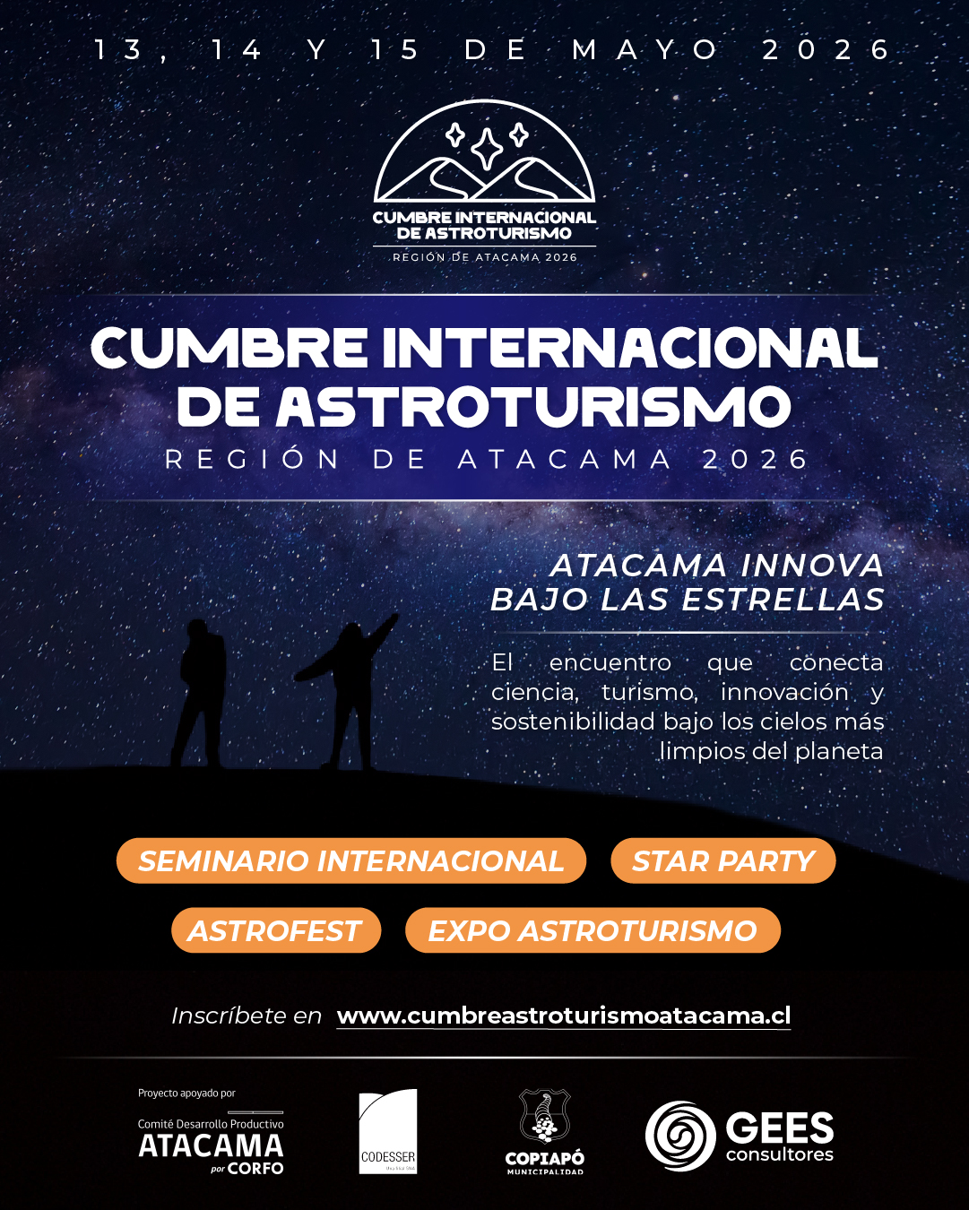Este evento contará con un seminario Internacional, una Expo Astroturismo, además de una Star Party y Astrofest. Cabe destacar que esta cumbre internacional es una iniciativa apoyada por el Comité de Desarrollo Productivo Atacama, en el marco del Programa Viraliza Eventos: Difusión y Emprendimiento de Corfo. El proyecto es ejecutado por Gees Consultores en alianza con Codesser y con la colaboración de la Ilustre Municipalidad de Copiapó.