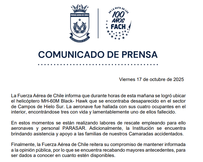 "Finalmente, la Fuerza Aérea de Chile reitera su compromiso de mantener informada a la opinión pública, por lo que se encuentra recabando mayores antecedentes, para ser dados a conocer en cuanto estén disponibles", sentenció.