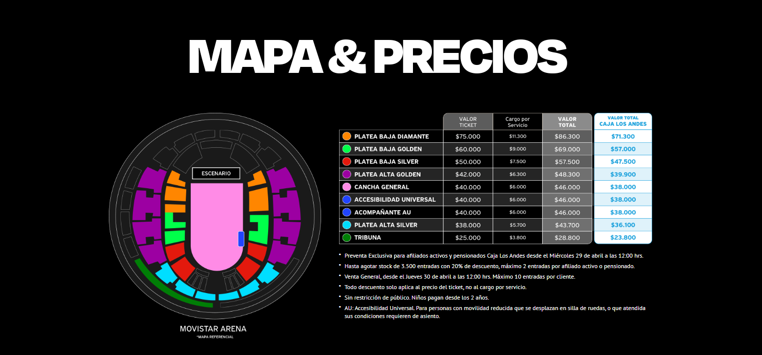 La productora ya confirmó el detalle de precios para el concierto en Santiago, incluyendo valores totales (con cargo por servicio) y precios con descuento para afiliados de Caja Los Andes: