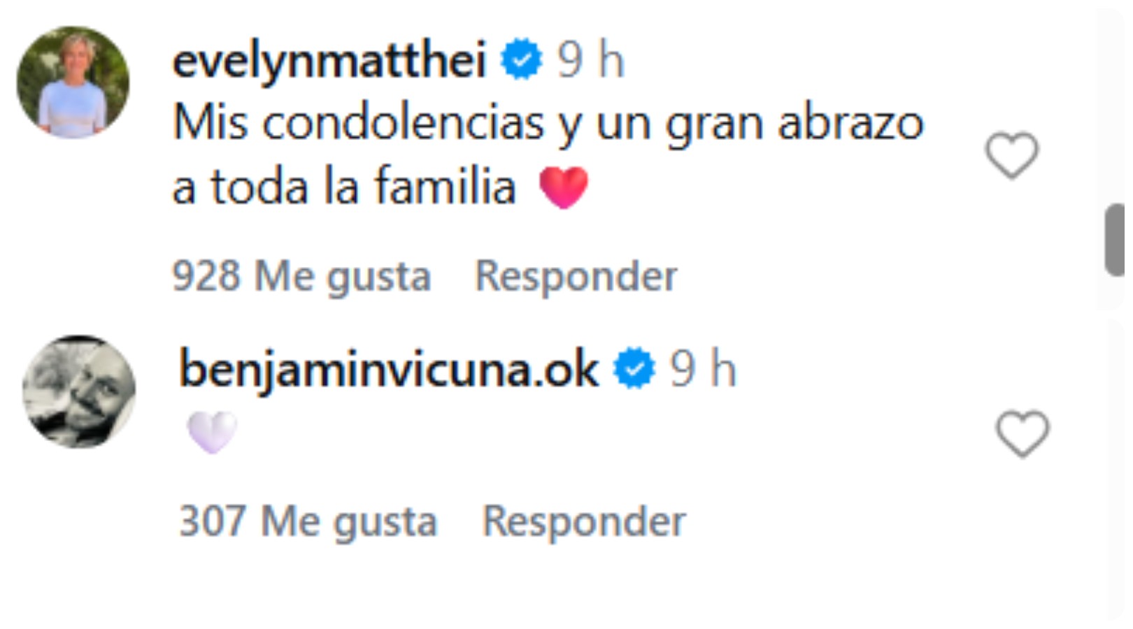 En la publicación, diversos rostros del espectáculo nacional le dieron apoyo ante el difícil momento que enfrentan como familia, entre ellos, Benjamín Vicuña, Eduardo Fuentes, Monserrat Álvarez, Michelle Carvalho y la excandidata presidencial Evelyn Matthei.