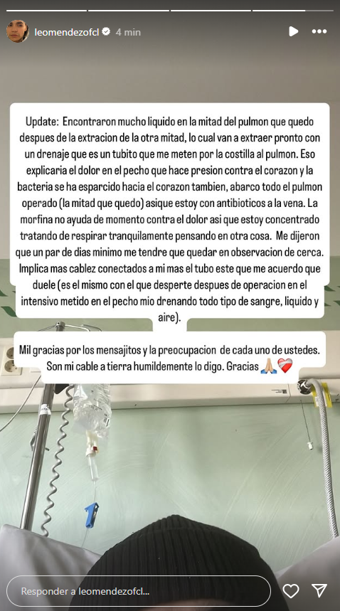 "Encontraron mucho líquido en la mitad del pulmón que quedó después de la extracción de la otra mitad, lo cual van a extraer pronto con un drenaje que es un tubito que me meten por la costilla al pulmón", detalló.