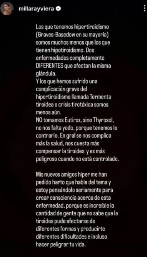 A través de su cuenta de Instagram, Viera entregó detalles respecto a la enfermedad que sufre y las complicaciones que debe enfrentar. "Los que tenemos hipertiroidismo (Graves-Basedow en su mayoría) somos muchos menos que los que tienen hipotiroidismo. Dos enfermedades completamente DIFERENTES que afectan la misma glándula”, comenzó.