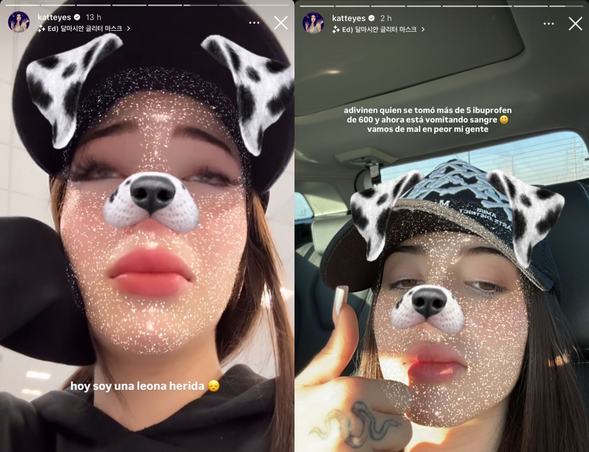 No obstante, lo que causó más preocupación fue su última publicación, donde relató que para calmar el dolor tomó más de cinco ibuprofenos de 600 miligramos. "Adivinen quién está vomitando sangre. Vamos de mal en peor, mi gente", cerró.