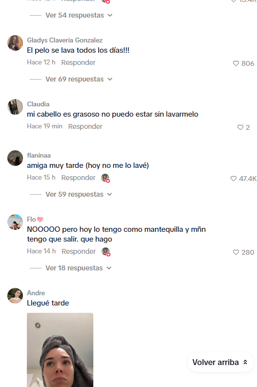 "Yo buscando excusas para no bañarme", "¡El pelo se lava todos los días!", "Mi cabello es grasoso no puedo estar sin lavármelo", escribieron varias de las seguidoras.